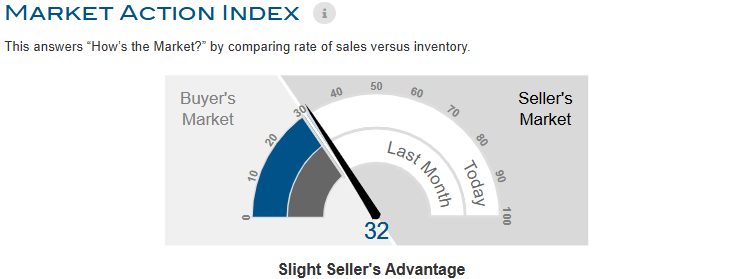The market has started cooling and prices have been flat for several weeks. Since we’re in the Seller’s zone, watch for changes in MAI. If the MAI resumes its climb, prices will likely follow suit. If the MAI drops consistently or falls into the Buyer’s zone, watch for downward pressure on prices.