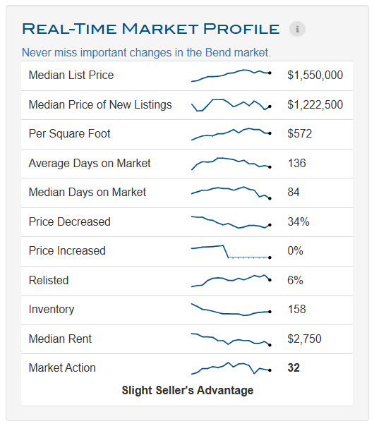 This week the median list price for Bend, OR 97703 is $1,550,000 with the market action index hovering around 32. This is about the same as last month's market action index of 32. Inventory has increased to 158.