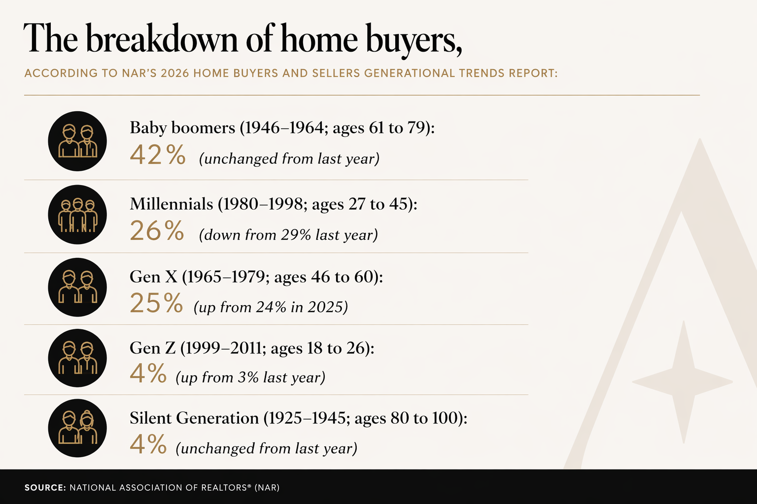 👉 Baby Boomers now make up the largest share of buyers.
